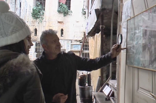 Müze sahibi Esat Kaplan, gelen ziyaretçilere büyüteç yardımı ile zeytin dalı ve asker figürlerini yakından gösteriyor.