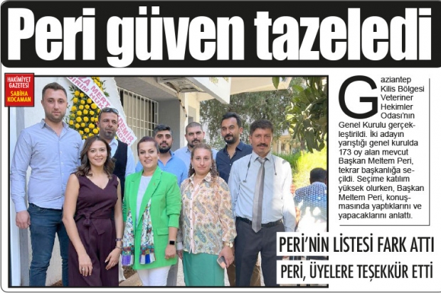 Gaziantep Kilis Bölgesi Veteriner Hekimler Odası'nın 19’uncu Genel Kurulu 24-25 Eylül 2022 tarihinde oda yönetim merkezinde gerçekleştirildi. 360 üyeden 204 kişi seçime katılım sağladı. 3 oyun geçersiz kullandığı seçimde Meltem Peri’nin listesi 179 oy alırken, diğer aday Tahsin Kılıç’ın listesi ise 28 oy aldı. Başkan Peri ve yönetimi hafta içi yapılacak toplantıda görev bölümü yapacak