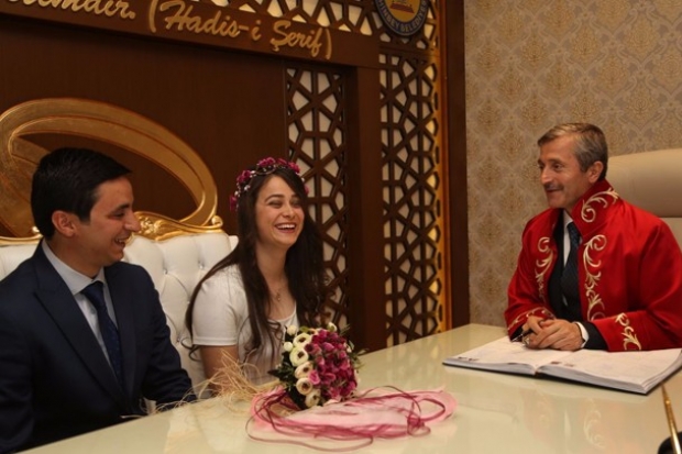 Türkiye’nin en fazla nikâhının kıyıldığı Şahinbey Belediyesi’nde, Şahinbey Belediye Başkanı Mehmet Tahmazoğlu, 10 Nisan Polis gününde bir polis memurunun nikâhını kıydı.