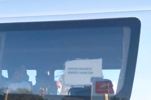 Gaziantep'te seyir halinde bulunan bir işçi servisinde yolcular, yanlarında seyir eden polis ekiplerini görünce maskelerine sarıldı. Üzerinde "maskesiz binilmez" uyarısının da bulunduğu aracı durduran ekipler, kuralları ihlal eden yolcu ve araç sürücüsüne ceza kesti.