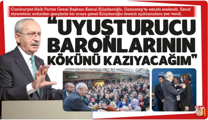 CHP Lideri Kemal Kılıçdaroğlu, Gaziantep'te önemli açıklamalarda bulundu. Esnaf ziyaretinin ardından gençlik buluşmasında konuşan Cumhuriyet Halk Partisi Genel Başkanı Kemal Kılıçdaroğlu, "Uyuşturucu baronlarının kökünü kazıyacağım. Torbacılar yakalanıyor, ya baronları nerede? Bundan kimsenin şüphesi olmasın" dedi.