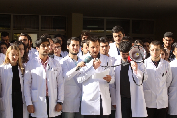 Açıklamanın ardından öğrenciler, yaşanan şiddet olaylarında hayatını kaybeden sağlık çalışanları için saygı duruşunda bulundular.