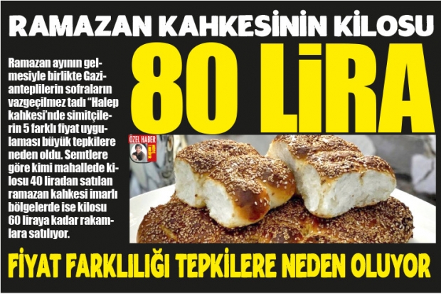 Ramazan ayının gelmesiyle birlikte Gazianteplilerin sofraların vazgeçilmez tadı “Halep kahkesi’nde simitçilerin 5 farklı fiyat uygulaması büyük tepkilere neden oldu. Semtlere göre kimi mahallede kilosu 40 liradan satılan ramazan kahkesi imarlı bölgelerde ise kilosu 60 liraya kadar rakamlara satılıyor.