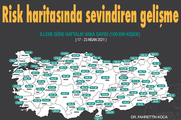 Sağlık Bakanı Fahrettin Koca, 100 bin kişide vaka sayısı haritasını yayınladı. Risk haritasında Gaziantep’te ki vaka sayısında düşüş gözlendi.
