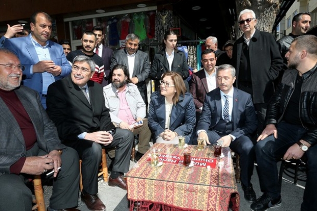 Gaziantep’in tüm taşra ilçelerine de giden Şahin, burada ilçe esnafı ve vatandaşlar ile bir araya gelerek referandum çalışmalarına destek veriyor.