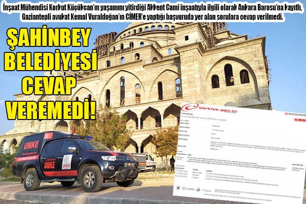 Gaziantep’te, iskelesi çöken ve enkaz altında kalan mühendis Korkut Küçükcan’a mezar olan cami inşaatı ile CİMER’e Bilgi Edinme Başvurusu kapsamında sorulan sorulara cevap verilmedi. Ankara Barosu’na kayıtlı, Gaziantepli avukat Kemal Vuraldoğan, Şahinbey İlçe Belediye Başkanlığı’nın cevaplandırılması talebiyle CİMER’e başvurdu. Vuraldoğan’ın, “Gaziantep ili Şahinbey İlçesi Bağlarbaşı mevkiinde 248 ada1 ve 2 nolu parsellerde kaçak bir inşaatın bulunup bulunmadığını, toplamda 14.000 bin metrekarelik inşaatın ruhsatının, mimari, statik ve iskele projelerinin olup olmadığının tarafıma bildirilmesi; ruhsat yok ise gerekli adli ve idari soruşturmanın gereğini talep ederim” şeklinde ki soruları cevapsız kaldı.