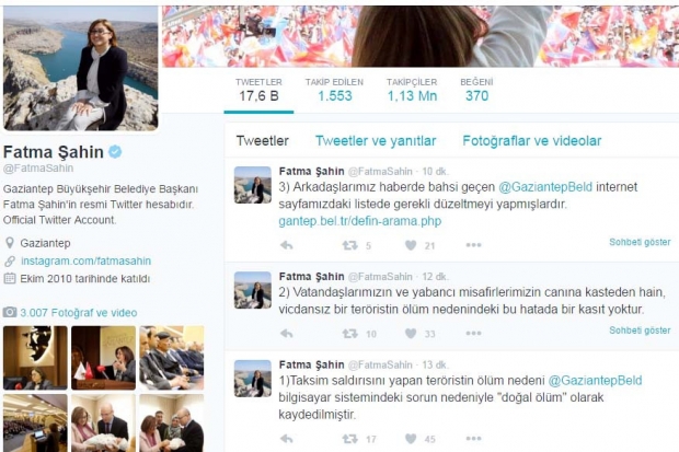 Gaziantep Büyükşehir Belediye Başkanı Fatma Şahin, Taksim saldırısını gerçekleştiren teröristin Gaziantep Büyükşehir Belediyesi’nin internet sayfasında yer alan ölüm nedeninin “doğal ölüm” olarak kaydedilmesiyle ilgili açıklama yaptı.