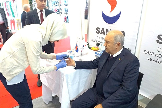 Fuarda açılan SANKO Üniversitesi Hastanesi standında dileyen katılımcı ve ziyaretçilerin ücretsiz tansiyon ve kan şekeri ölçümü yapılıyor. Yoğun ilgi gören stantta hastanede verilen sağlık hizmetleri ile uygulamalar konusunda da bilgiler paylaşılıyor.