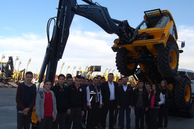 Öğrenciler, fabrika gezisi ve Sanko Makine ile ilgili yapılan sunumun ardından makine parkını ziyaret ederek, iş makinelerinin önünde hatıra fotoğrafı çektirdi.