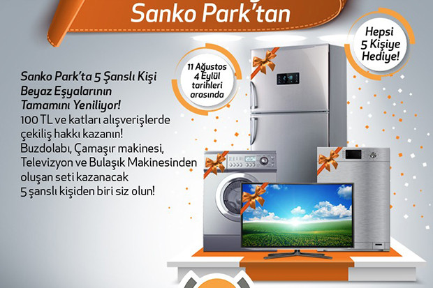 SANKO Park’a 11 Ağustos-4 Eylül 2017 tarihleri arasında gelerek aynı gün içerisinde toplamda en az 100 TL alışveriş karşılığında çekilişe katılacak olan 5 şanslı kişi televizyon, buzdolabı, çamaşır makinesi ve bulaşık makinesinden oluşan 4’lü setin sahibi olacak.