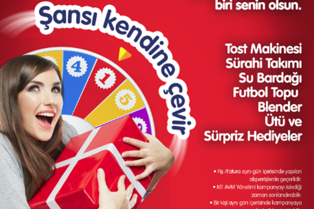 M1 Gaziantep AVM Müdürü Sait Can Gizir, 26 Aralık 2016-17 Şubat 2017 tarihleri arasında AVM’deki mağazalardan yapılacak her 100 TL’lik alışverişe “Şans Çemberi”nden bir çekiliş hakkı vereceklerini bildirdi. Gizir, kampanaya katılanların tost makinesi, sürahi takımı, futbol topu, su bardağı, blender ve sürpriz hediyeler kazanma imkanı bulacağını kaydetti.