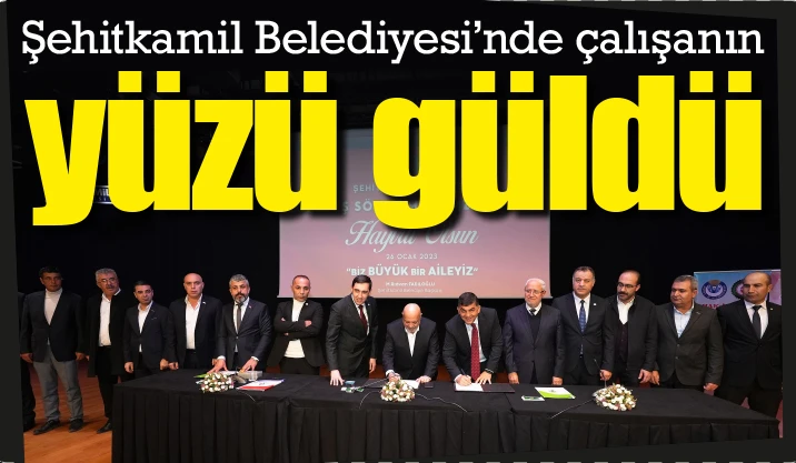 Şehitkamil Belediyesi ile Hak-İş Konfederasyonu ve Hizmet-İş Sendikası arasında düzenlenen toplu iş sözleşmesi, Şehitkamil Kültür ve Kongre Merkezi’nde imzalandı. Programa; Şehitkamil Belediye Başkanı Rıdvan Fadıloğlu, Hak-İş Konfederasyonu ve Hizmet-İş Sendikası Genel Başkanı Mahmut Arslan, Şehitkamil Belediyesi Başkan Yardımcıları Murat Özgüler, Ceyda Gürsel, Serkan Özatıcı, Mehmet Ali Korkmaz, Fatih Ermeydan, Hak-İş Konfederasyonu ve Hizmet-İş Sendikası Gaziantep İl Başkanı Halil İbrahim Tanrıöver ve Şehitkamil Belediyesi çalışanları katıldı.