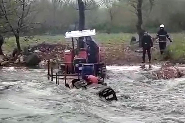 Gaziantep'te tarladan dönen biri çocuk 4 kişilik ailenin bulunduğu traktör, bir anda taşan dere sularının arasında kaldı. Dakikalarca suyun içerisinde mahsur kalan aile, başka bir traktör yardımıyla kurtarıldı