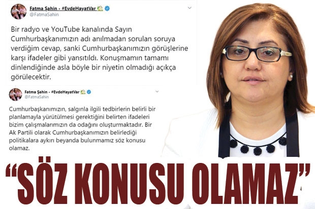 Gaziantep Büyükşehir Belediye Başkanı Fatma Şahin, Cumhur başkanı Erdoğan'ın CHP'li belediyeler için yaptığı PKK ve FETÖ benzetmesine karşı çıktığı açıklamalarda "Bir AK Partili olarak Cumhurbaşkanımızın belirlediği politikalara aykırı beyanda bulunmamız söz konusu olamaz" dedi.