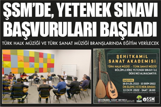 Şehitkamil Sanat Merkezi (ŞSM) bünyesinde hizmet sunan Şehitkamil Sanat Akademisi’nde açılan Türk Halk Müziği ve Türk Sanat Müziği bölümlerine öğrenciler, yetenek sınavı ile alınacaklar. 17 yaşını doldurmuş kişilerin başvuru yapabileceği yetenek sınavına, 10 Ekim 2022 tarihine kadar müracaat edilebilecek. Ön eleme yetenek sınavı ise 13 Ekim 2022 günü saat 18:00’da yapılacak.