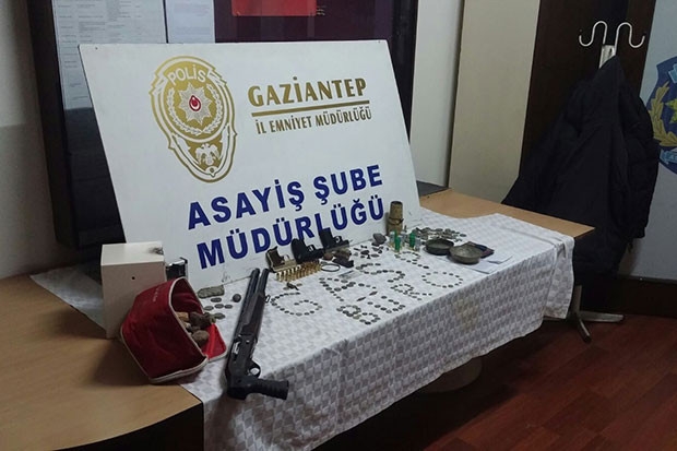 Şüpheli şahsın aracında ve ikametinde yapılan aramada, 1 adet gerçek tabanca, 1 adet kuru sıkı tabanca, 1 adet kısa dipçikli av tüfeği, 1 adet namlu kısmı açık tabanca ve şarjörü, 8 adet av tüfeği fişeği, 35 adet tabanca mermisi, 260 adet çeşitli ebatta tarihi metal para (sikke), küçük heykel tarihi eser, 1 adet deri üzerine Arapça yazılı ayet parçası tarihi eser ele geçirildi.