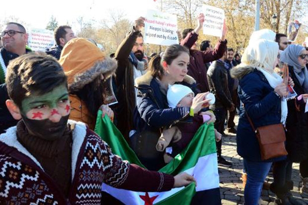 Birleşmiş Milletler'in, Halep'e yapılan saldırılara sessiz kaldığını belirten grup; Türkçe, Arapça ve İngilizce sloganlar atarak İran ve Rusya'nın Halep'ten çıkmasını istedi.