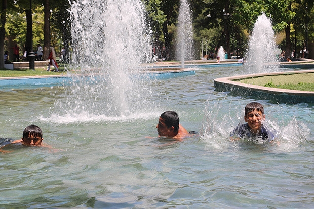 Gaziantep'te hava sıcaklığından bunalan çocuklar süs havuzunda serinliyor.