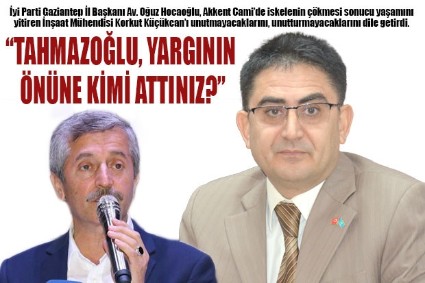 İYİ Parti Gaziantep İl Başkanı Av. Oğuz Hocaoğlu, Akkent Cami’de yaşanan olayın ardından yaşamını yitiren İnşaat Mühendisi Korkut Küçükcan’la ilgili başlatılan yargı sürecinin takipçisi olacaklarını anlattı. Hocaoğlu, “biz, bazı AKP yöneticileri ve vekilleri gibi, para ile diploma almadık, vekil olduktan sonra bilim aşkına bürünmedik. Sorduğumuz sorulara ise hala cevap alamadık? Sayın Mehmet Tahmazoğlu’na sorduğumuz sorulara hala cevap alamadık? Her gün yerel basında pembe tablo çizmeyi, güzel resimler altında güzel sözler söylemeyi de biliyorsunuz. Ancak biz ne istediğimizi biliyoruz. Biz unutmayız, unutturmayız” dedi.