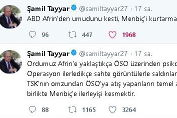AK Parti Gaziantep Milletvekili Şamil Tayyar, sosyal medya hesabından yaptığı paylaşımda, ABD’nin Afrin'den umudunu kestiğini, Menbiç'i kurtarmanın telaşında olduğunu aktardı. Tayyar, bir diğer paylaşımında ise, “Ordumuz Afrin'e yaklaştıkça ÖSO üzerinden psikolojik bariyer kuruluyor. Operasyon ilerledikçe sahte görüntülerle saldırılar arttırılacak. TSK'nın omzundan ÖSO'ya atış yapanların temel amacı, PKK/PYD'yi korumakla birlikte Menbiç'e ilerleyişi kesmektir” ifadelerini kullandı.