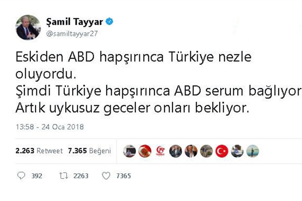 Gaziantep Milletvekili Şamil Tayyar, sosyal medya hesabından yaptığı paylaşımla ABD’ye göndermede bulundu. Tayyar, paylaşımında , "Eskiden ABD hapşırınca Türkiye nezle oluyordu. Şimdi Türkiye hapşırınca ABD serum bağlıyor. Artık uykusuz geceler onları bekliyor” ifadelerini kullandı.