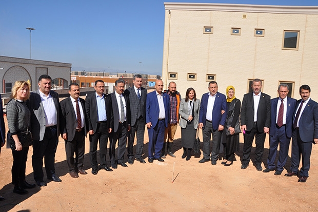 Reyhanlı ilçesinde Suriyeli yetimler için yaptırılan ve inşaatı devam eden yaşam alanına hareket eden komisyon üyeleri, yapımı devam eden yaşam alanında bilgi aldılar.