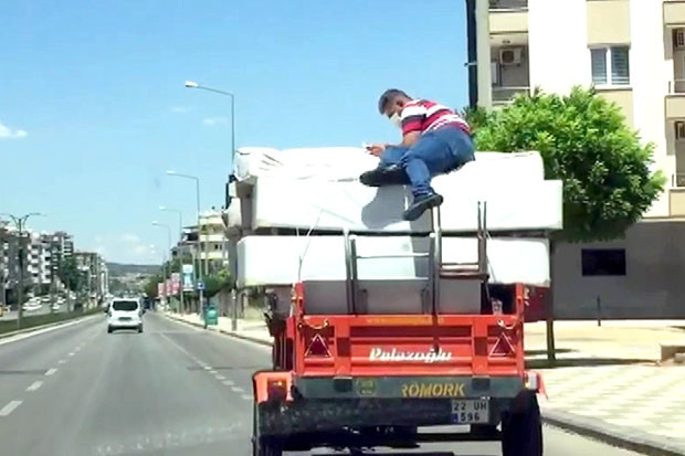 Gaziantep'te ev eşyası yüklü olan bir traktörün römorkunda yolculuk yapan kişi, kazaya davetiye çıkardı. Gaziantep’in en işlek caddelerinden Rasafyolu'nda ilerleyen traktörün eşya yüklü römorkunda oturan kişi tehlikeli şekilde yolculuk etti. Tehlikeye aldırış etmeden elindeki cep telefonuyla oynayan kişi, düşme tehlikesi de geçirdi. O anları sürücüler cep telefonu ile kaydetti.