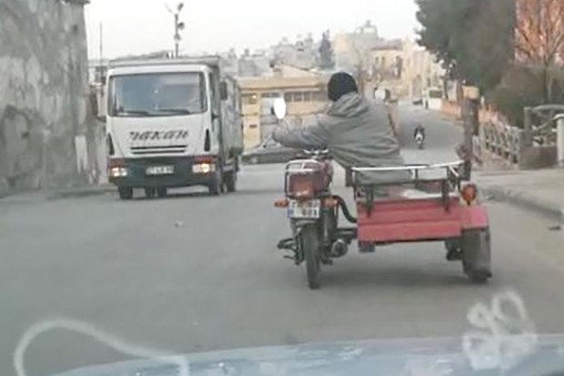 Gaziantep'in Nizip ilçesi Pazar Cami Mahallesi'nde bir motosiklet sürücüsünün tekeri patlak sepetli motoru, motor koltuğundan değil de sepette oturarak sürmesi görenleri hayrete düşürdü. Tekeri patladığı için ağırlığı sepet tarafına veren sürücü, dakikalarca bu şekilde seyir etti. Oturduğu sepetten motosikleti kullanan sürücünün bulduğu tehlikeli yöntem yürekleri ağza getirdi. Başka bir araç sürücüsünün telefonu tarafından kaydedilen görüntülerde sürücünün rahatlığı görenlere pes dedirtti.