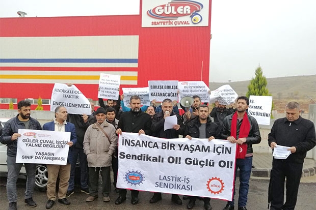 “Yıllardır çalıştıkları, ter döktükleri, emek verdikleri Güler Çuval’da düşük ücretle ve son derece kötü koşullarda çalışıp sefalet içinde yaşadıkları yetmiyormuş gibi, üstüne bir de fabrika müdüründen sürekli azar ve küfür işitmek, hakarete uğramak durumunda kalıyorlar. Bu fabrikada işçiler, Pazar günleri dahi 12 saat mesai yaparak haftanın yedi günü tatil yapmadan çalışıyorlar. İşçilere, iş kıyafeti ve iş kazası riskine karşı gerekli olan iş ayakkabısı dahi verilmiyor. İşte bu ve buna benzer pek çok soruna karşı, insanca yaşanabilecek bir ücret, insanca çalışma koşulları ve insan yerine konmak için sendikamız çatısı altında örgütlenmek ve birlik olmak istediler. Ama hepsinden önemlisi de, kaderlerinin işverenin ve müdürlerin iki dudağı arasında olmadığı, çalışma koşulları, ücretler, fazla mesailer ve sosyal haklar başta olmak üzere, işyerinde kendileriyle ilgili her konuda söz ve karar hakkına sahip olacakları, tüm hakları Toplu İş Sözleşmesi ile güvence altına alınmış şekilde ve iş güvencesine sahip olarak çalışmak için sendikalı olmak istiyorlar.”