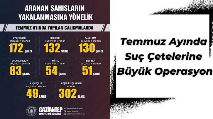 Gaziantep İl Emniyet Müdürlüğü, Temmuz ayı boyunca aranan şahısların yakalanmasına yönelik yürüttüğü çalışmalar kapsamında büyük bir başarıya imza attı. Toplamda 2.646 yıl 7 ay kesinleşmiş hapis cezası bulunan 973 aranan şahıs yakalanarak adli mercilere teslim edildi.
