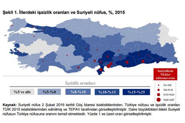 Dünya Bankası verileri ve Göç İdaresi istatistiklerine dayanılan raporda, yerel nüfuslarına oranla en çok Suriyeli göçmene ev sahipliği yapan iller, sırasıyla yüzde 97 ile Kilis, yüzde 25 ile Hatay, yüzde 20 ile Şanlıurfa yüzde 17 ile Gaziantep ve yüzde 12 ile Mardin olarak listelendi. Suriyelileri barındıran Düzey 2 Bölgesi, yani Gaziantep, Adıyaman ve Kilis için ise, işsizlik oranının 2015’te yaklaşık yüzde 25’lik artışla yüzde 10.1’e çıktığı belirtildi.