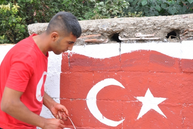 İslahiye, Beyler Mahallesi Tahaffuzhane Caddesi 17 ve 18 nolu evlerde yaşayan iki kardeşten 23 yaşındaki Anadolu Üniversitesi Halkla İlişkiler Bölümü öğrencisi Yunus Kaplan, yan komşusu ablasının eviyle birlikte, teröre verdiği tepkisini bahçe duvarlarına çizdiği Türk bayraklarıyla ifade etti.