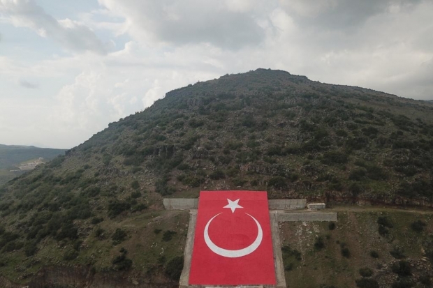 Suriye'nin Afrin kentindeki Darmık dağında bulunan ve Zeytin Dalı Harekatı sırasında TSK tarafından bombalanan terör örgütü elebaşı Öcalan portresinin yerine dev Türk bayrağı yapıldı.