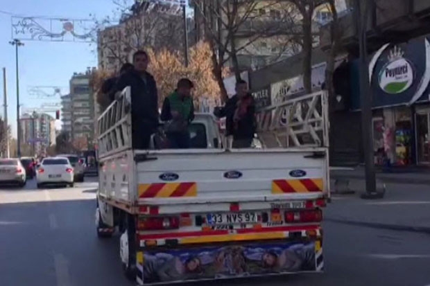 Yaklaşık 1 kilometre gittikten sonra MOBESE kameralarını fark eden darbukacı, "Abi kamera var sonra çalayım” diyerek arkadaşlarını da ikaz etti. Konseri bitiren gençler, kamyonet kasasında tehlikeli yolculuklarına devam etti.