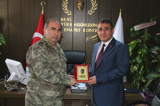 Sağlık Komutanı Tümamiral Prof. Dr. Hayati Bilgiç, il Sağlık ve Halk Sağlığı Müdürü Dr. Turgay Happanİ'yi ziyaret ederek, plaket takdim etti.