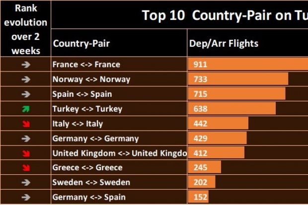 Öte yandan uçuş sayısı bakımında aynı gün Fransa 911 uçuşla birinci, Norveç 733 uçuşla ikinci, İspanya 715 uçuşla üçüncü, 638 uçuşla Türkiye ise dördüncü sırada yer aldı.