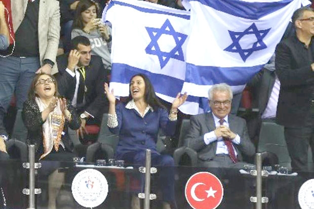 “22 Şubat 2017'de Gaziantep'te FIBA Avrupa Kupası için oynanan Gaziantep Basketbol ile İsrail ekibi Ironi Nahariya maçında çekilmiş bir görüntü. Ben orada Türk bayrağını kaldırıyorum. Maç için Gaziantep'e gelen İsrail Kültür ve Spor Bakanı Miri Regev de kendi ülkesinin bayrağını.”