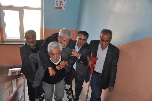 Bedensel engelli 58 yaşındaki Mehmet Adak, akülü sandalyeile geldiği okulda, sandığının bulunduğu 3'üncü kattaki salona okuldaki görevlinin sırtında çıkarak oyunu kullandı.