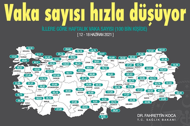 İllere göre haftalık Kovid-19 vaka sayısı, her 100 bin kişide İstanbul'da 51,27, Ankara'da 93,11, İzmir'de 25,99, Gaziantep’te ise 33.74 oldu. Sağlık Bakanı Fahrettin Koca; “Aşı ile bitecek” dedi. Sağlık Bakanı Fahrettin Koca sosyal medya hesabından yaptığı paylaşımda illere göre haftalık vaka sayılarını gösterek haritayı paylaştı. Bakan Koca İllerimizde 100.000 nüfusa karşılık gelen bir haftalık toplam vaka sayısını gösteren insidans haritasının güncel halini yayınladı. Bakan Koca; “Vaka sayılarının düşüş hızı azalsa da normalleşmeye engel değil. Aşı ile bitecek." ifadelerini kullandı.