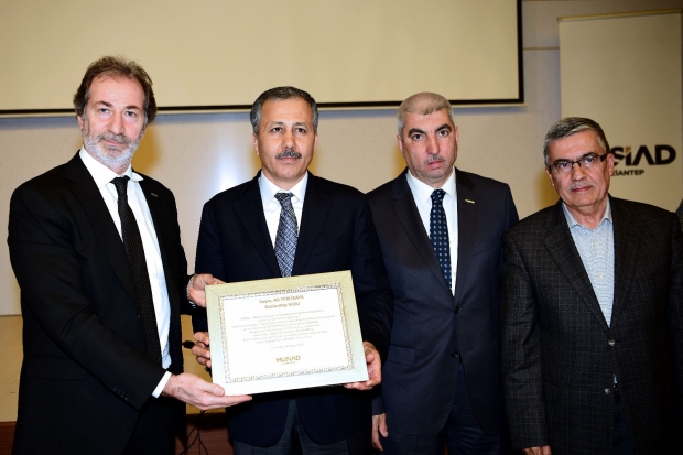 Buluşmada MÜSİAD Gaziantep Şubesi tarafından Vali Ali Yerlikaya adına dikilen 27 fidan sertifikası Başkan Çelenk tarafından takdim edildi.