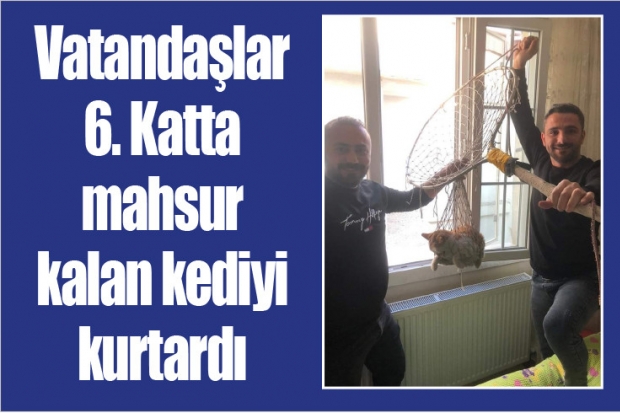 Vatandaşlar mahsur kalan kedinin korkup düşmemesi için Kuşçu filesine tavuk eti attı. Kedi filenin içine düşürülerek kurtarıldı.