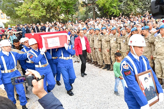 Gözyaşlarıyla al bayraklı tabuta sarılan şehidin babasını teselli eden Vali Davut Gül, şehidin tabutu üzerindeki Türk bayrağı ve fotoğrafını baba Önek’e teslim etti.