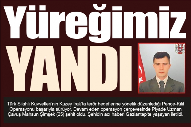 Türk Silahlı Kuvvetleri'nin Kuzey Irak’ta terör hedeflerine yönelik düzenlediği Pençe-Kilit Operasyonu başarıyla sürüyor. Devam eden operasyon çerçevesinde Piyade Uzman Çavuş Mahsun Şimşek (25) şehit oldu. Şehidin acı haberi Gaziantep'te yaşayan iletildi.