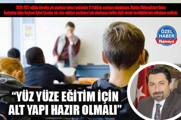 Makine Mühendisleri Odası Gaziantep Şube Başkanı Aykut Kocalar, “Okulların büyük b ölümünde mekanik havalandırma sistemlerinin bulunmadığı, havalar soğuyunca doğal havalandırmanın da çok güçleşeceği, sınıfların boyutları ve kalabalık öğrenci sayıları dikkate alındığında sosyal mesafe kurallarına göre oturma ve ders düzeninin sağlanmasının mümkün olamayacağı açıktır” dedi. Kocalar diğer yandan ise okulların fiziki alt yapısının hazır hale getirilerek, yüz yüze eğitime bir an önce başlanması gerektiğine dikkat çekti.